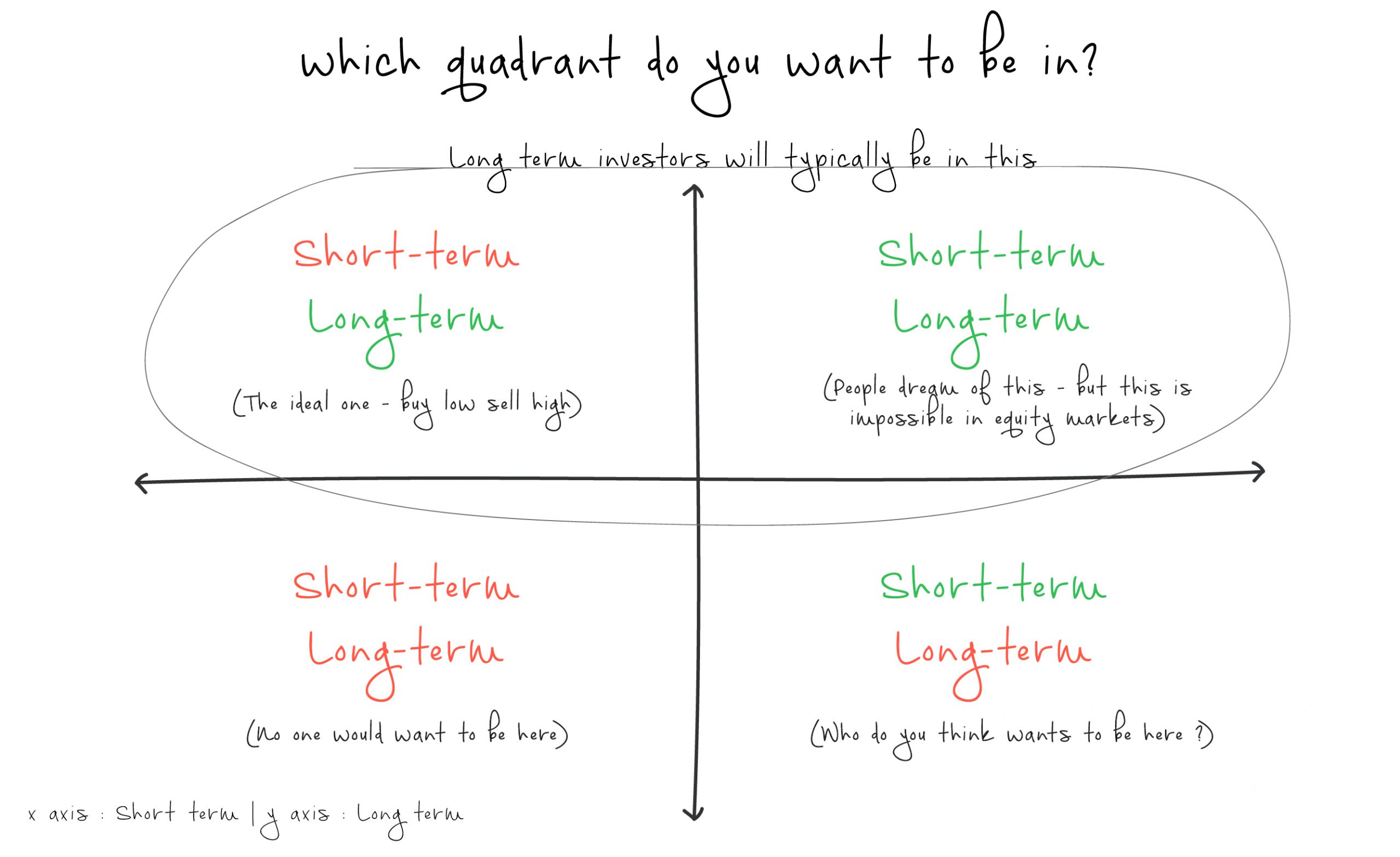 Everyone wants to be in this Quadrant. Most of the investing errors are committed thanks to our strong desire to always be in this quadrant. Truth be told – it is simply not possible in the stock market. While there are times (it’s as high as 70-75%) when you will be Short Term Green, any Long-Term Green investor will at least spend 25-30 % (if not more) of the time in the Short-Term Red Quadrant. This is the reality of how stock markets operate.