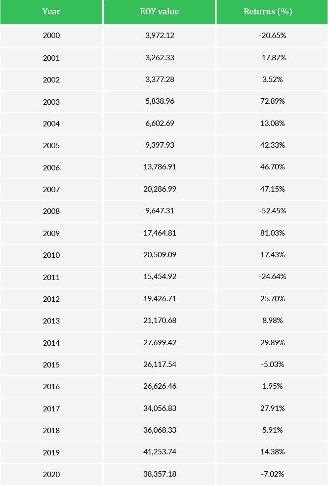 First, some data dump of the last 42 years of Sensex performance (every year from 1979 – 2020). The table shows the calendar year, the corresponding Sensex level at the end of the year and the performance for the year. Though 2020 is not yet done, I am still assuming it as a negative year (though no one knows how it will end).