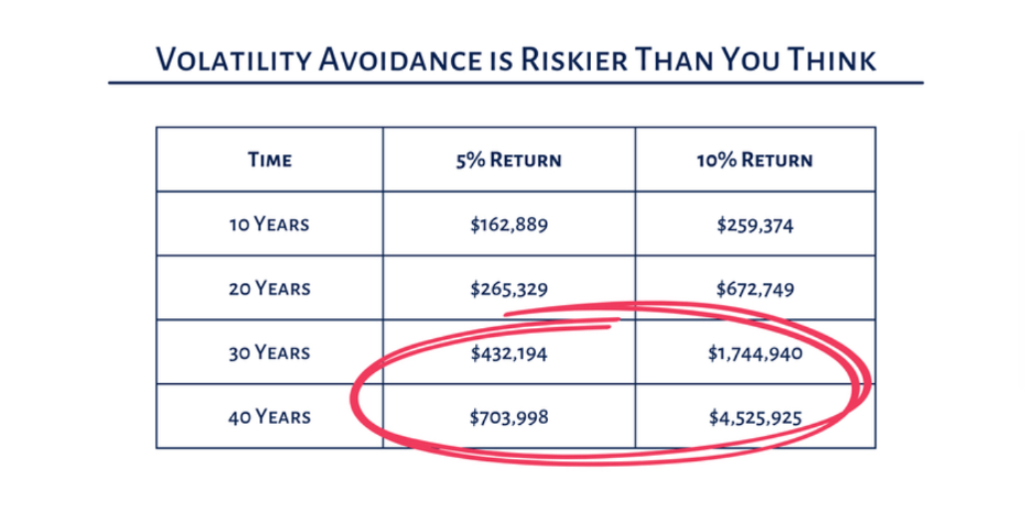 The table tells the same story. At a 5 percent return, your money grows, but slowly. Over 40 years, $100,000 becomes about $704,000. That looks fine until you compare it with the 10 percent return. The same $100,000, facing more volatility along the way, grows to over $4.5 million. The gap is staggering. It is the difference between staying afloat and truly changing your future.